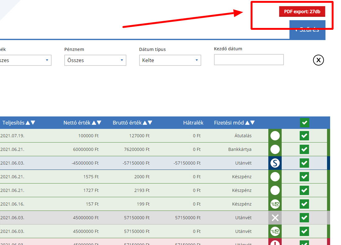 3. Kattints a PDF export gombra és készen is vagy, a kiválasztott számlákat egy egybefüggő PDF-ben megkapod.