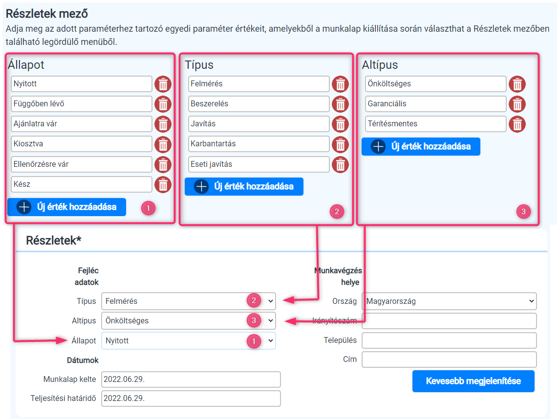 Altípus: A munkalapon a Részletek mezőben adható meg a munkalap altípusa, amely a generált bizonylaton is megjelenik