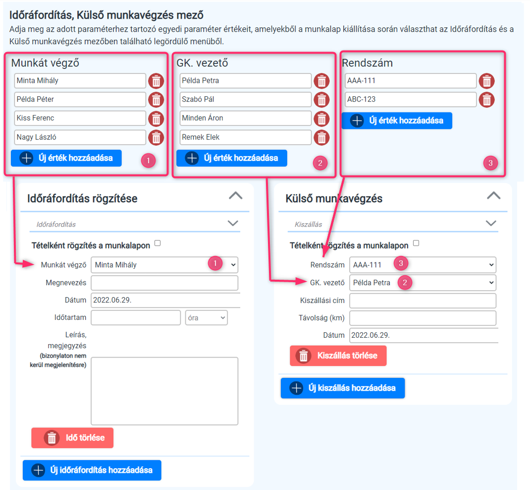 Munkát végző: Felrögzíthetjük azokat a munkatársakat, akikkel időráfordítás kerül rögzítésre a munkalapokon, így már csak egy lenyíló menüből kell őket kiválasztani.