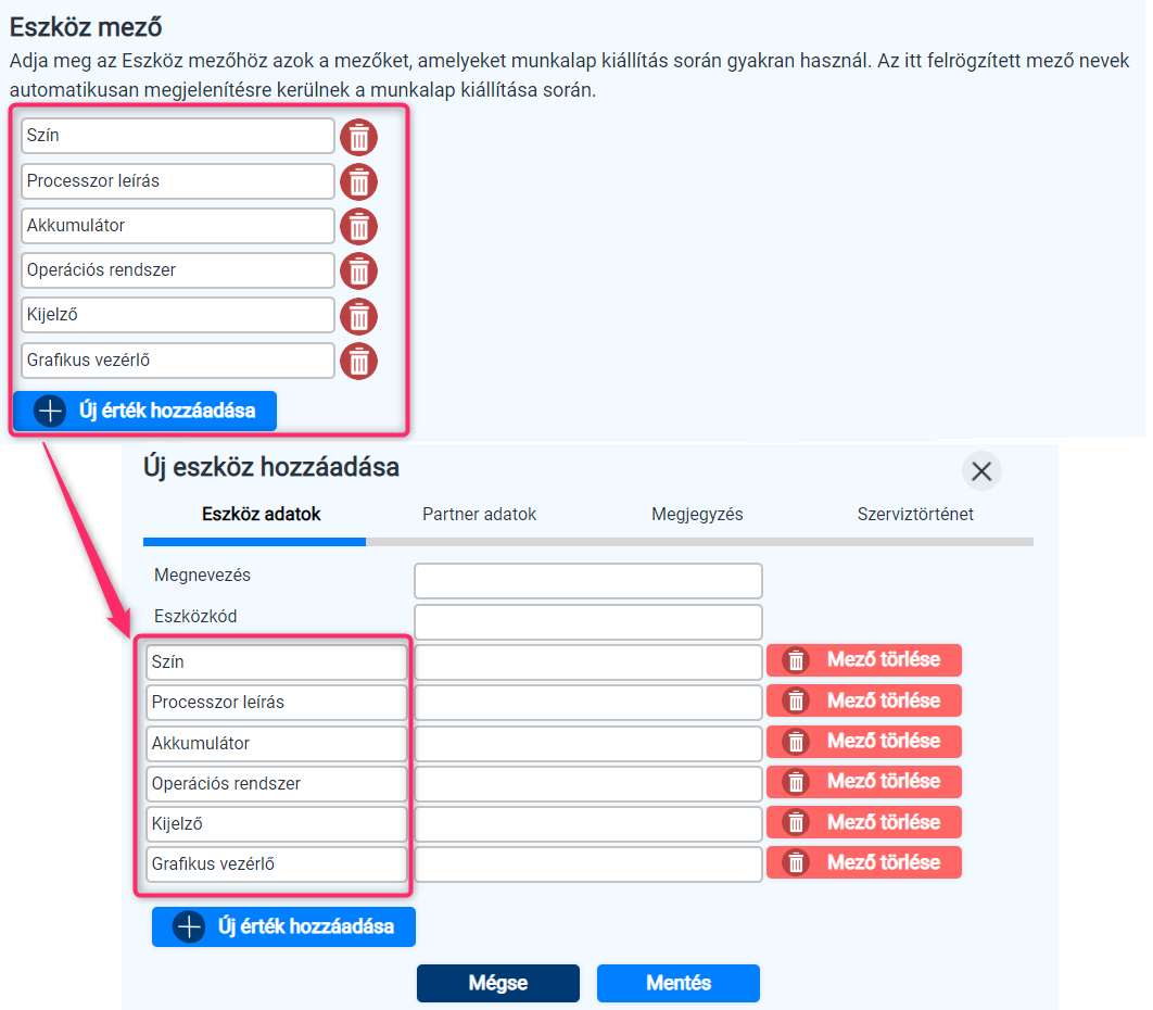 Ezen mező eltér a fenti 6 mezőtől, ugyanis itt azt tudjuk beállítani, hogy melyek azok a mezőnevek amelyeket leggyakrabban használni szoktunk az eszközök rögzítésekor (pl. gyáriszám, motorkód, stb), a beállított mezőnevek automatikusan megjelennek az Új eszköz hozzáadásakor az első lapon, így már csak a ténylege érték beírása lesz a feladatunk.